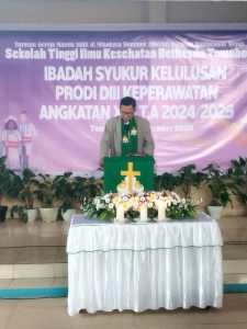 Ibadah Syukur Yudisium Mahasiswa Angkatan XXI Prodi D3 Keperawatan STIKES Bethesda Tomohon Tahun 2025 di laksanakan pada Tanggal 25 September 2025. yang di hadiri oleh Yayasan Gmim Ds.A.Z.R .Wenas di wakilkan oleh Bpk. Drs.Jan Soriton,DEA , Ketua STIKES Bethesda Tomohon Ibu Dr.Ns. Djoise Kaunang, S.Pd., S.Kep.,M.Kes., dan Wakil STIKES Bethesda Tomohon Ibu Elizabeth Purba,Spd., SST.,M.Les. Beserta Para Dosen Dan Tendik yang ada.